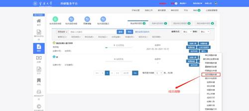4. 进入项目组成员,请确认成员是否完整。特别是项目中有学生的参与的,请完善学生身份类别。成员信息有问题的,进入科研系统黑料,左侧的项目界面,点击操作下拉框下的成员调整申请,进入成员调整界面进行添加和修改,待项目主管审核之后,会自动补充到项目经费公开一览表,最后再提交即可。