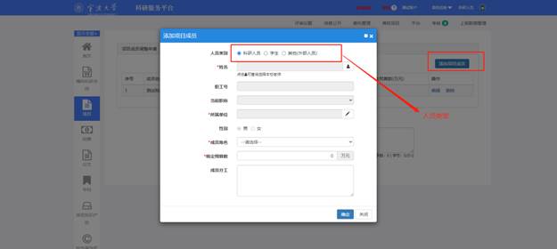 4. 进入项目组成员,请确认成员是否完整。特别是项目中有学生的参与的,请完善学生身份类别。成员信息有问题的,进入科研系统黑料,左侧的项目界面,点击操作下拉框下的成员调整申请,进入成员调整界面进行添加和修改,待项目主管审核之后,会自动补充到项目经费公开一览表,最后再提交即可。