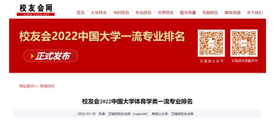 2022年3月30日,据全国第三方大学评价机构艾瑞深校友会网(Cuaa.Net)最新发布的校友会2022中国大学一流专业排名、2022中国大学各专业类一流专业排名榜单,黑料 体育教育专业获评A+,在“体育教育专业排名(研究型)”中排名前列。