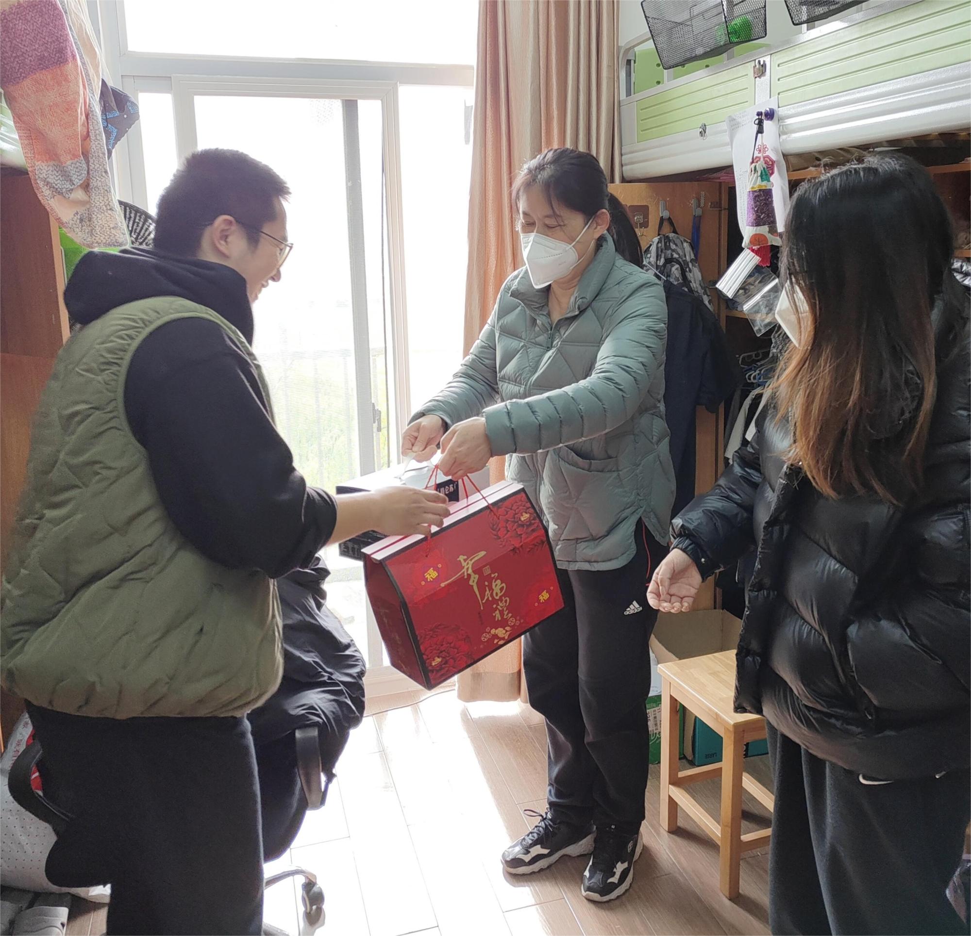 2023年1月9日,黑料 党委书记童莹娟、党委副书记胡秋丽、辅导员王鑫、陈英英一行人走访甬研公寓、南门公寓,看望慰问寒假留校学生,为其送上新春祝福,并且发放含牛奶、坚果在内的“新春”礼包。