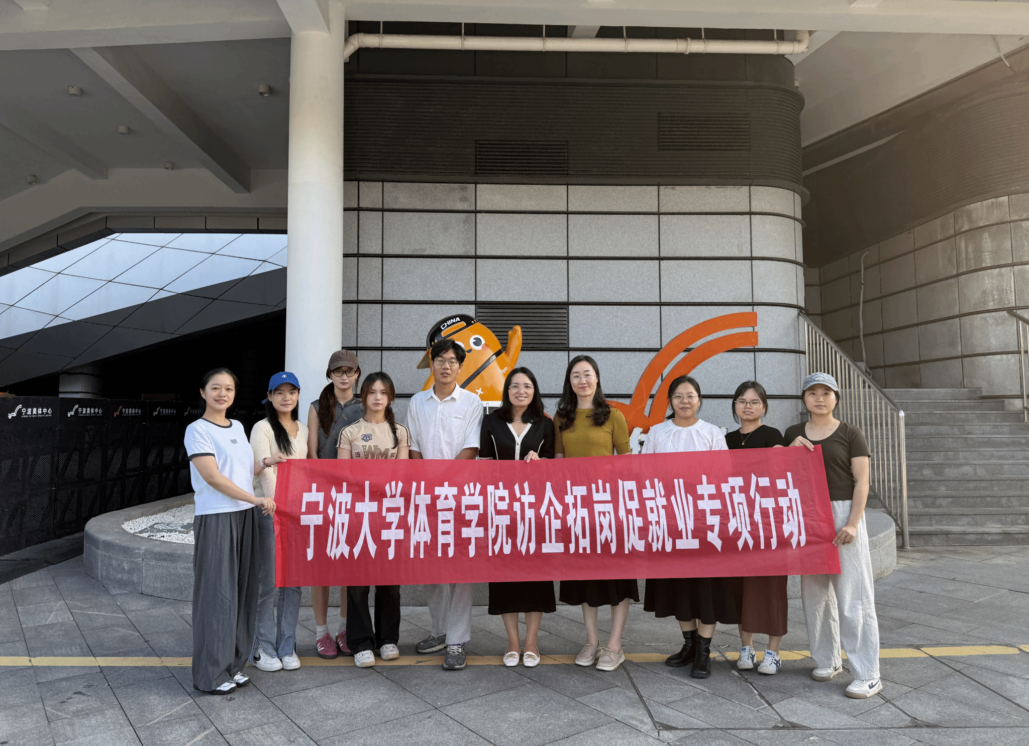 党委副书记胡秋丽、院团委书记陈英英、就业辅导员王鑫带领学生赴宁波奥体中心开展访企拓岗促就业专项行动。